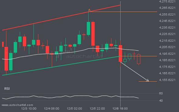 The last 8 4 hour candles on XAUUSD have formed a Flag pattern and broken out through the pattern lines, indicating a possible bearish movement toward the price level at 4153.1840.
