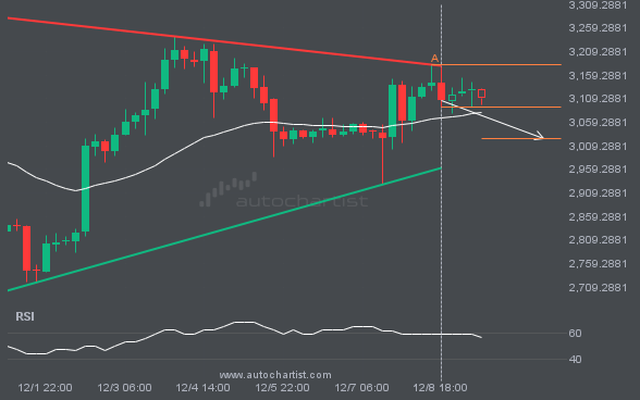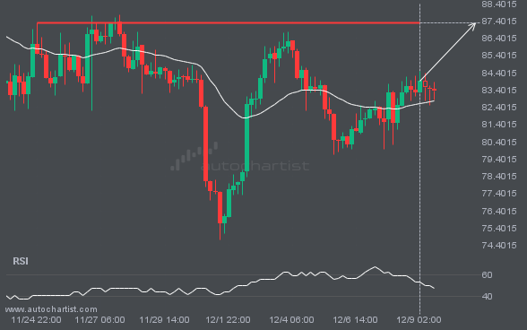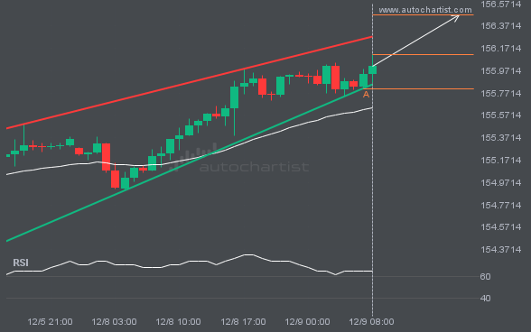An emerging Rising Wedge has been detected on USDJPY. The pattern has not yet broken through support, but the price is expected to move up over the next few hours. At the time the pattern was found, the price was 156.1155, and it is expected to move to 156.4702.