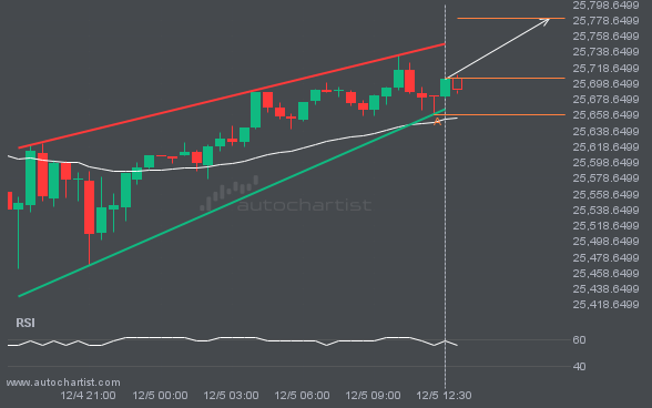 NAS100 is moving toward a resistance line it has tested many times. It has retraced from this line before, so it’s unclear whether it will break through or rebound again. If NAS100 continues on its current trajectory, it could reach 25781.0429 within the next 5 hours.