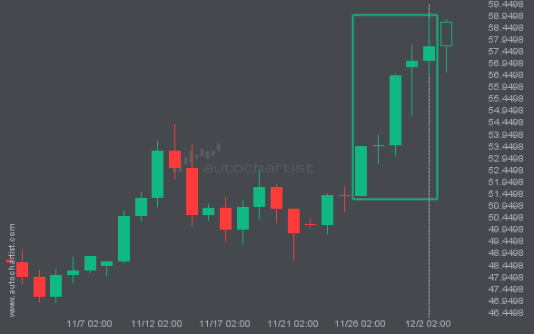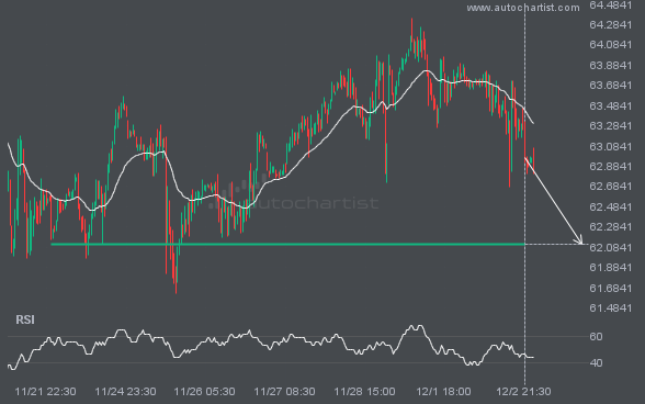BRN/USD is heading toward 62.1120 and could reach this level within the next 2 days. It has tested this level numerous times in the past, and this time could be no different, ending in a rebound rather than a breakout. If a breakout does not occur, we may see a retracement back to current levels.