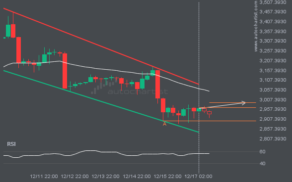 ETHUSD is moving toward a resistance line. Since it has retraced from this line before, we may see either a breakout through it or a rebound to current levels. It has touched this line multiple times in the past 10 days and may test it again within the next 2 days.