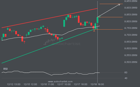 FTSE100 is moving toward a resistance line. Since it has retraced from this line before, we may see either a breakout through it or a rebound to current levels. It has touched this line multiple times in the past 10 days and may test it again within the next 13 hours.