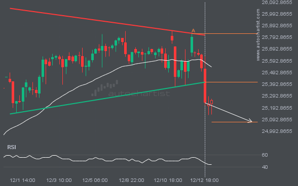 NAS100 has moved through the support line of a Triangle pattern at 25410.605817647058 on the 4 hour chart. This line has been tested multiple times in the past, and this breakout could signal an upcoming change in the current trend. Price may continue in the current direction toward 25071.0980.