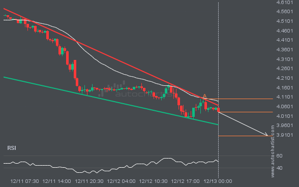 NGC/USD is moving toward a support line. Since it has retraced from this line before, we may see either a breakout through it or a rebound to current levels. It has touched this line multiple times in the past 3 days and may test it again within the next 13 hours.