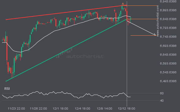 Rising Wedge pattern identified on S&P500 has broken through a support level, with price momentum continuing to move downward. This presents a solid trading opportunity, with the price expected to reach 6750.2777 in the next 3.