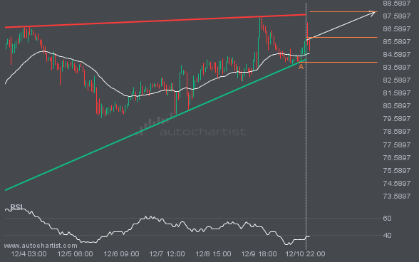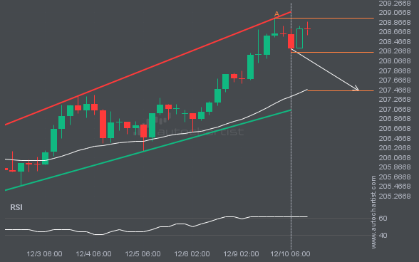 GBPJPY was identified around 208.2395 after recently rebounding off the resistance on the 4 hour interval. Ultimately, the stock’s price action has formed a Channel Up pattern. This squeeze may increase the chances of a strong breakout. The projected move could take the price to around 207.4464.