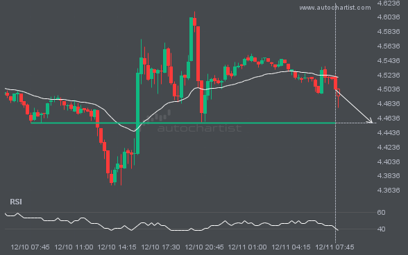 NGC/USD is approaching the line at 4.4565. If this move continues, the price of NGC/USD could test 4.4565 within the next 5 hours. But do not rush to trade. It has tested this line many times in the past, so the move could be short-lived and end in a rebound.
