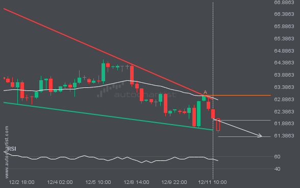 BRN/USD is moving toward a support line. Since it has retraced from this line before, we may see either a breakout through it or a rebound to current levels. It has touched this line multiple times in the past 11 days and may test it again within the next 3 days.