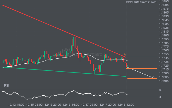 EURUSD is moving toward a support line it has tested many times. It has retraced from this line before, so it’s unclear whether it will break through or rebound again. If EURUSD continues on its current trajectory, it could reach 1.1691 within the next 2 days.