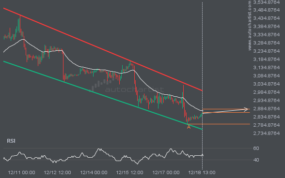 ETHUSD is moving toward a resistance line. Since it has retraced from this line before, we may see either a breakout through it or a rebound to current levels. It has touched this line multiple times in the past 11 days and may test it again within the next 3 days.