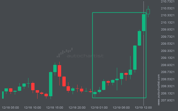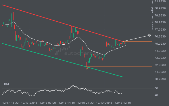FTSE100 is moving toward a resistance line. Since it has retraced from this line before, we may see either a breakout through it or a rebound to current levels. It has touched this line multiple times in the past 10 days and may test it again within the next 13 hours.