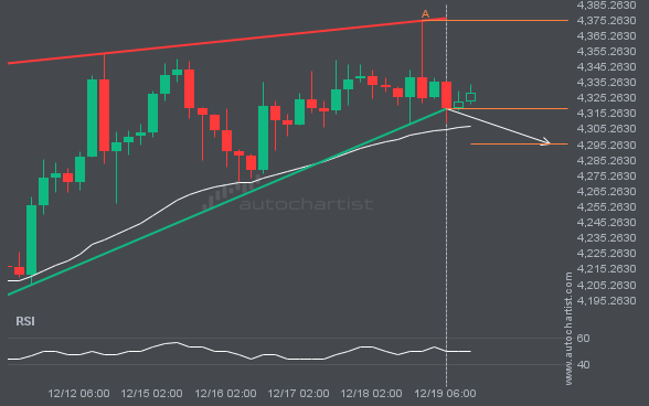 XAUUSD has broken through the support line, which it has tested twice before. We have seen it retrace from this line before, so wait for confirmation of the breakout before trading. If this new trend persists, a target level around 4295.5352 may materialize within the next 2 days.